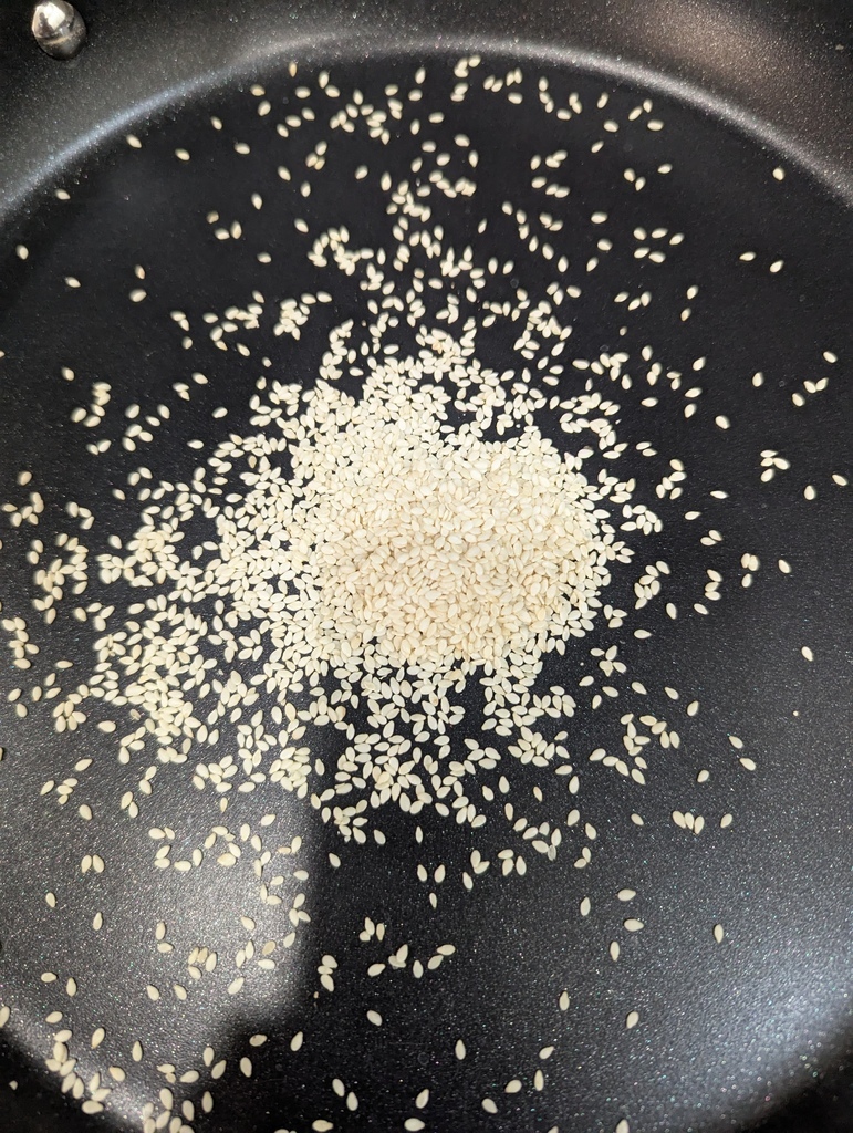 將白芝麻放入鍋中,翻炒至金黃色,此時鍋中不要加任何東西