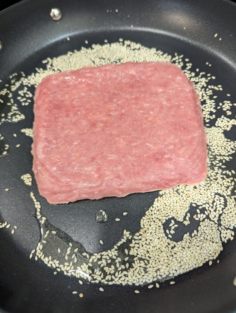 待白芝麻金黃色後,放入油及火雞肉絞肉,火雞肉絞肉直接放入鍋中,無需事先調味
