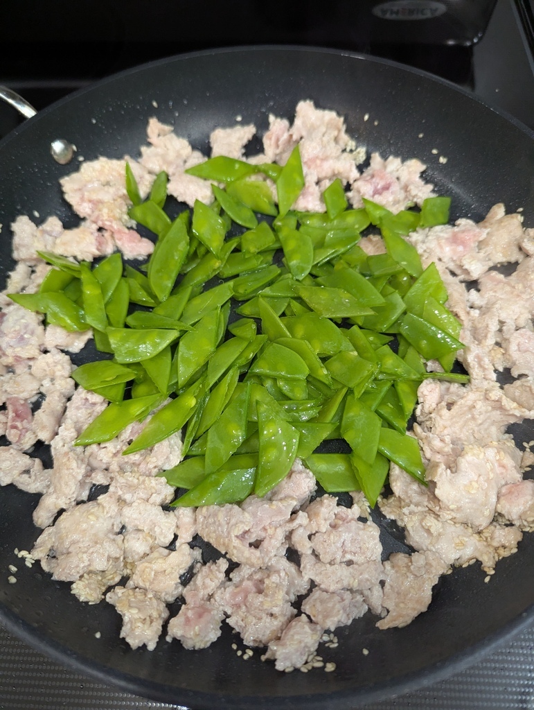 放入荷蘭豆,將火雞肉絞肉煎至金黃同時煮熟荷蘭豆