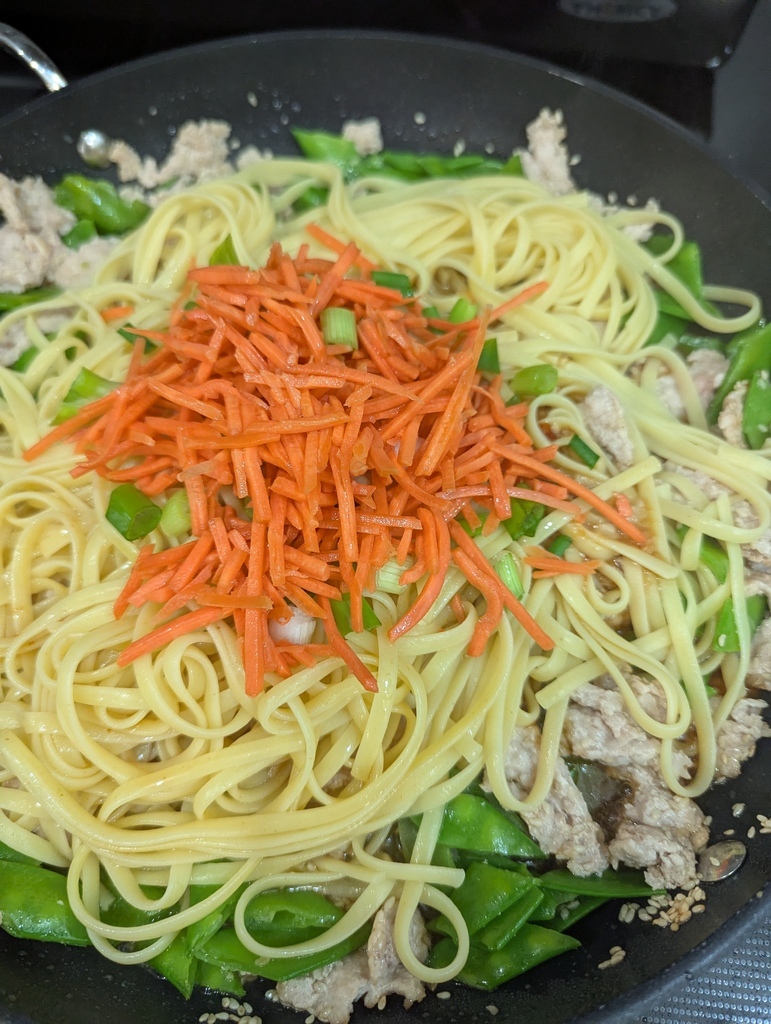 將煮好的義大利麵條、紅蘿蔔絲、青蔥、調味醬放入,拌勻